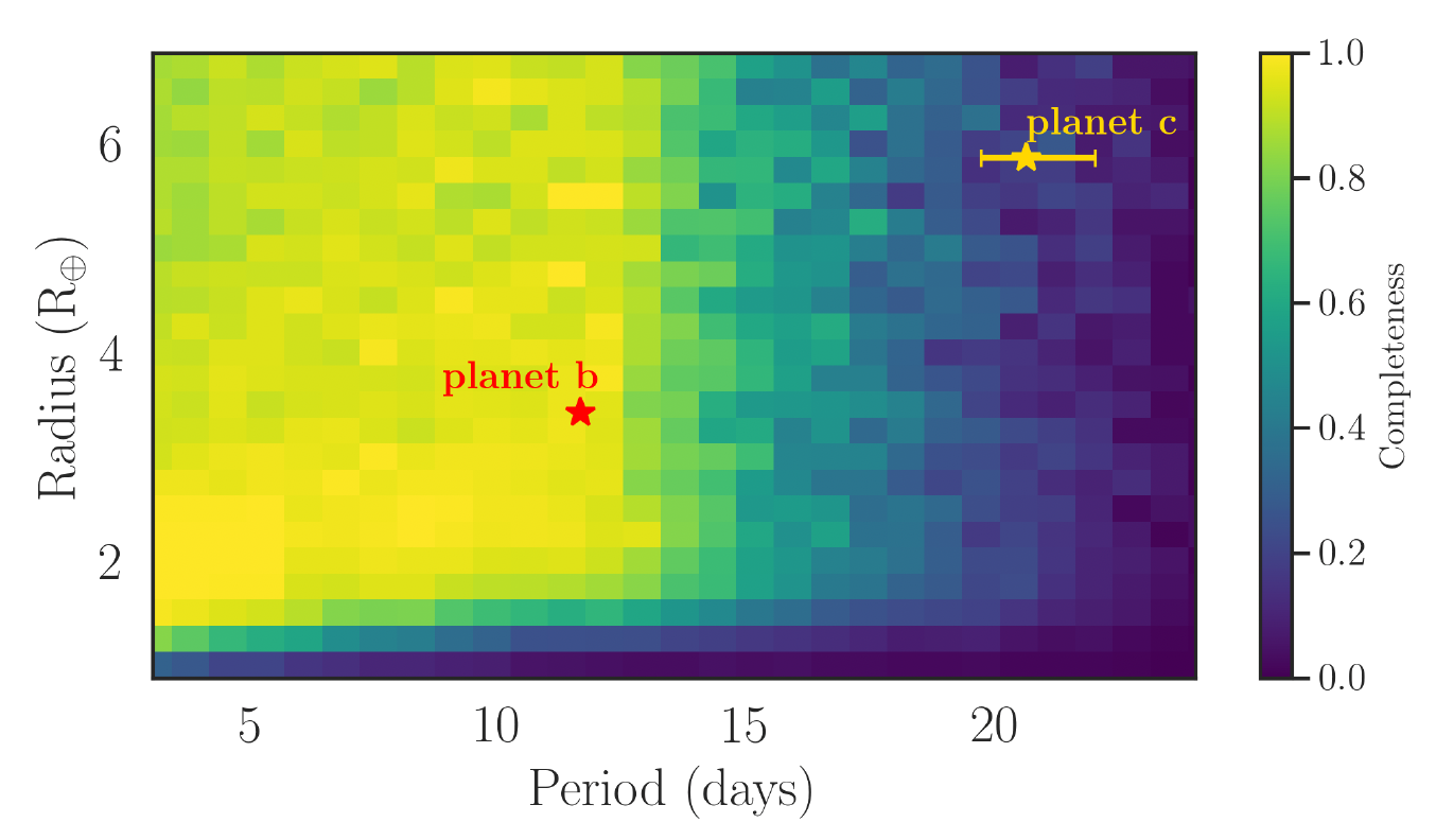 Following the detection of planets b and c, I explored the possibility of additional transiting planets within the system. I did this by quantifying the detectability of additional planets in the TESS light curve using a transit injection and recovery test. I generated the injected signals using the open-source batman python package (Kreidberg, 2015), with planet radii ranging from 1 to 12 R⊕ and periods ranging from 3 to 24 days (approximately the duration of the sector), both sampled at random from a log-uniform distribution in order to over-sample the smaller planets that are more difficult to recover. I simulated and injected a total of 750 000 transit events. The BLS algorithm was then used to try to recover the injected signals, with a search that sampled a frequency grid that was evenly-spaced from 0.01 to 1 day−1. For each simulation, the period and orbital phase corresponding to the highest peak in the BLS periodogram were recorded. If the recovered orbital period and phase agreed to within 1% of the injected signal, the injection was deemed to be correctly identified.Overall, this analysis highlights the difficulties associated with detecting longer period planets using automated algorithms.